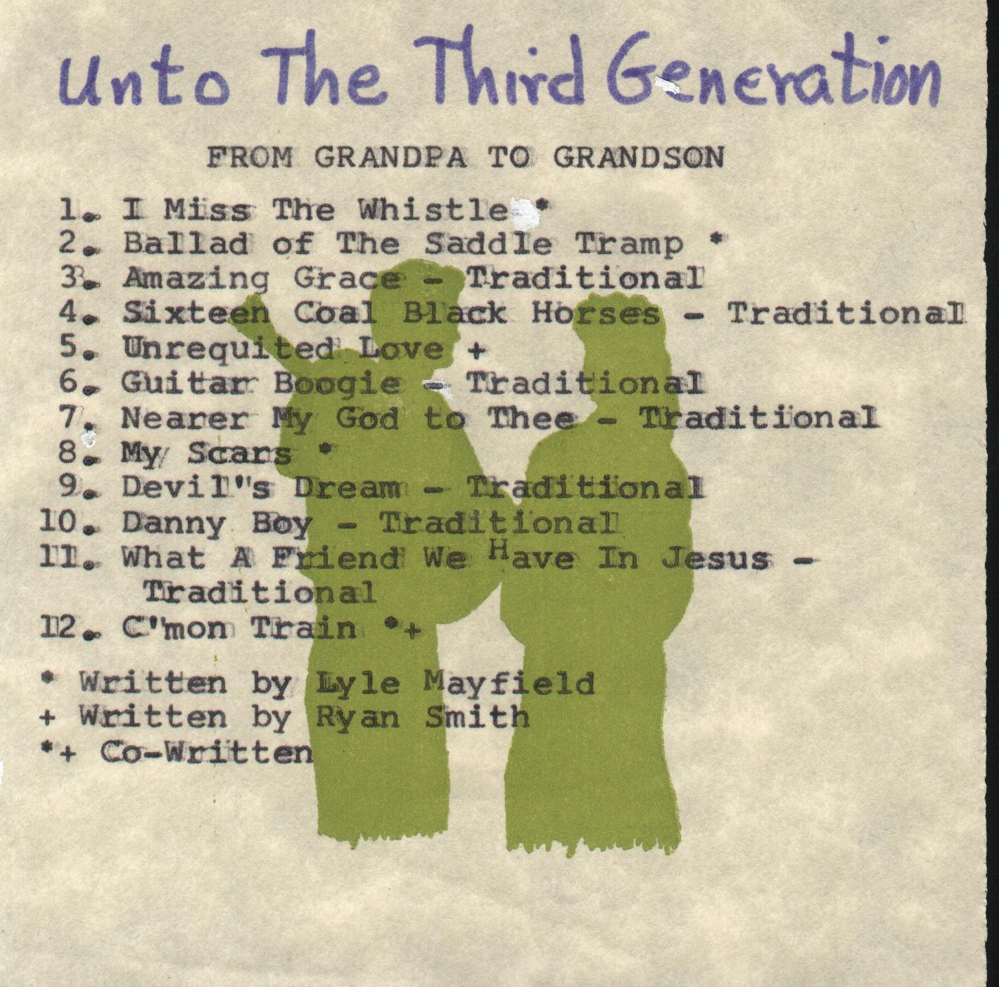 One of the most satisfying pleasures that can come to a person is to know that your progeny is busy carrying on a legacy you started. That’s why this album is so meaningful to me. It contains the work of our grandson, Ryan Smith, working with his old grandad to produce an album featuring traditional music along with some coming from his pen and mine. It also features some of the instrumental work of Ryan which warms the heart of his grandmother and me. All of the credit for the compilation of what you hear on this CD goes to him. He researched our music files, our album master and chose all the numbers you hear. A special source of pride for me is the final track on this CD. "C’mon Train" combines the lyrics of Ryan and my melody and instrumental work. He jotted down the words while returning to his home in Dallas from a visit with grandad and grandmother. We hope it’s the first of many we’ll do together. Hope you like what we’ve done.---Lyle Mayfield